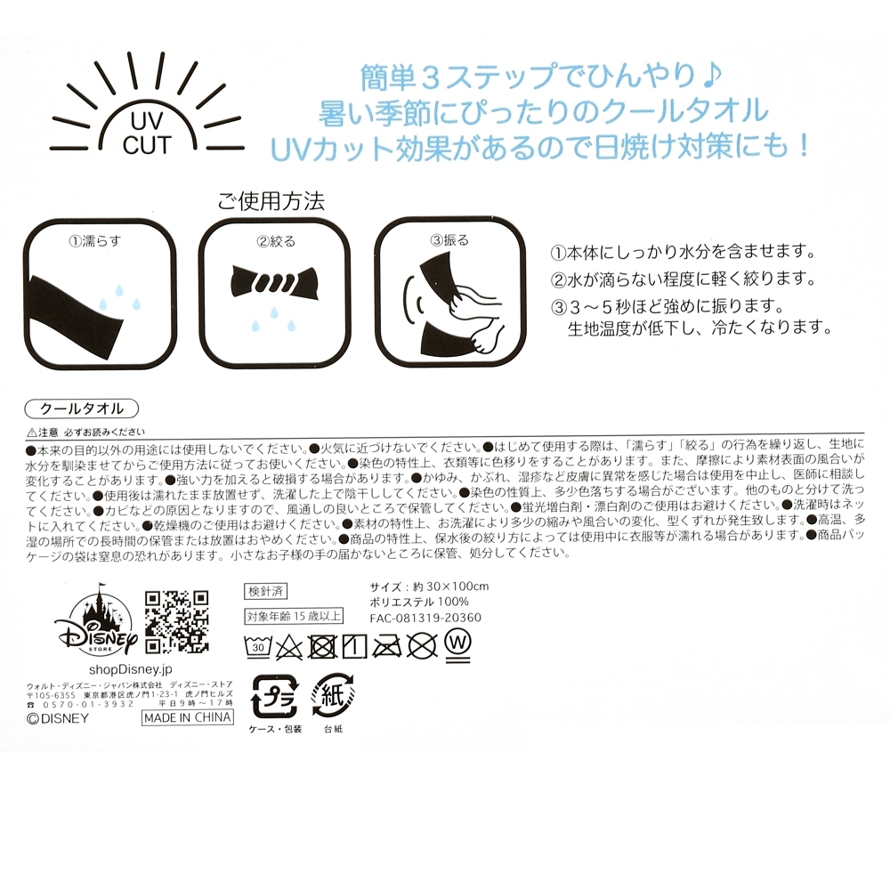 迪士尼推出最適合炎熱季節的清涼毛巾♪ 弄濕、擰乾、搖晃,保持涼爽舒適! 搖動濕毛巾,水分就會蒸發,毛巾就會變涼。 布料經過防紫外線處理,因此可以保護您免受紫外線傷害☆您可以在觀看體育比賽、外出、在家或任何地方時輕鬆保護自己免受炎熱,還可以保護您免受曬傷和中暑。 包含一個帶拉鍊的乙烯基袋,方便攜帶和存放小物品。 ■角色:迪士尼 ■商品編號: